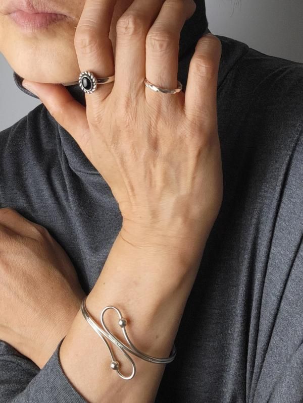 つややかな漆黒の輝きを放つブラックオニキスが、マニッシュなワンポイントを着こなしにプラス。