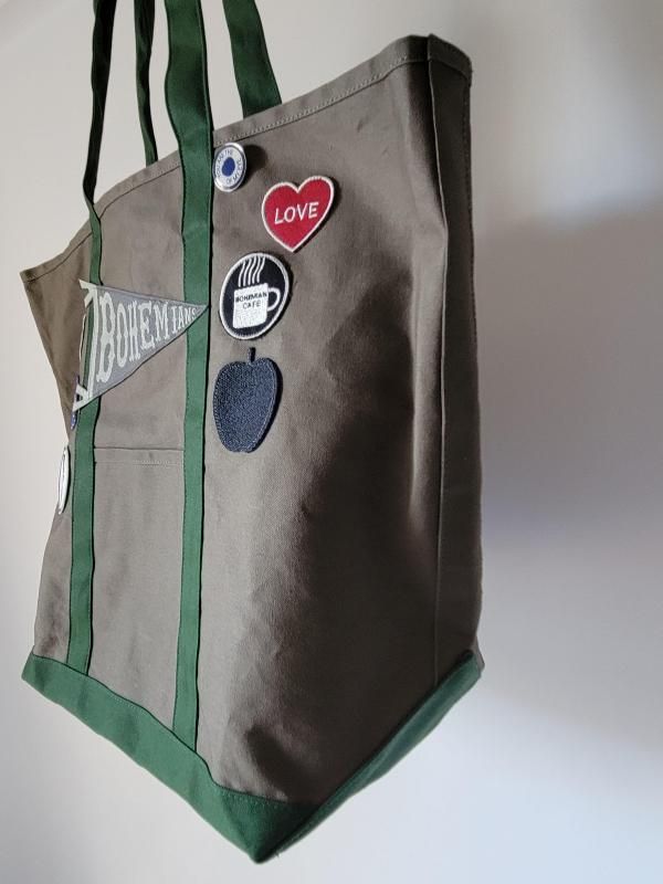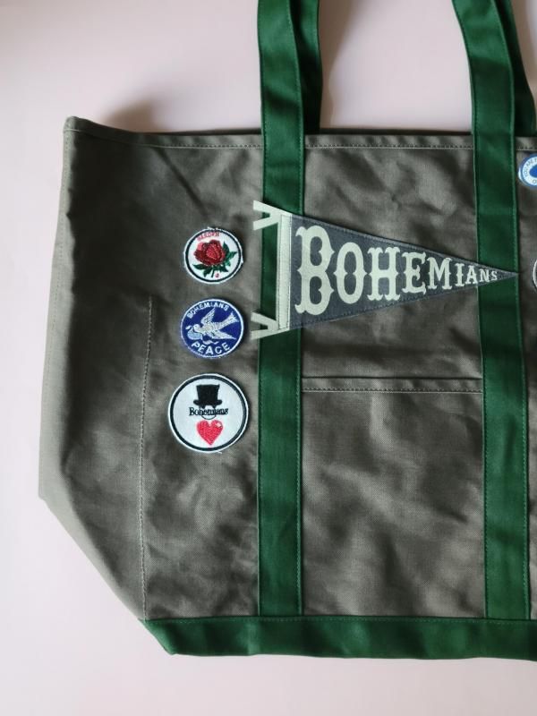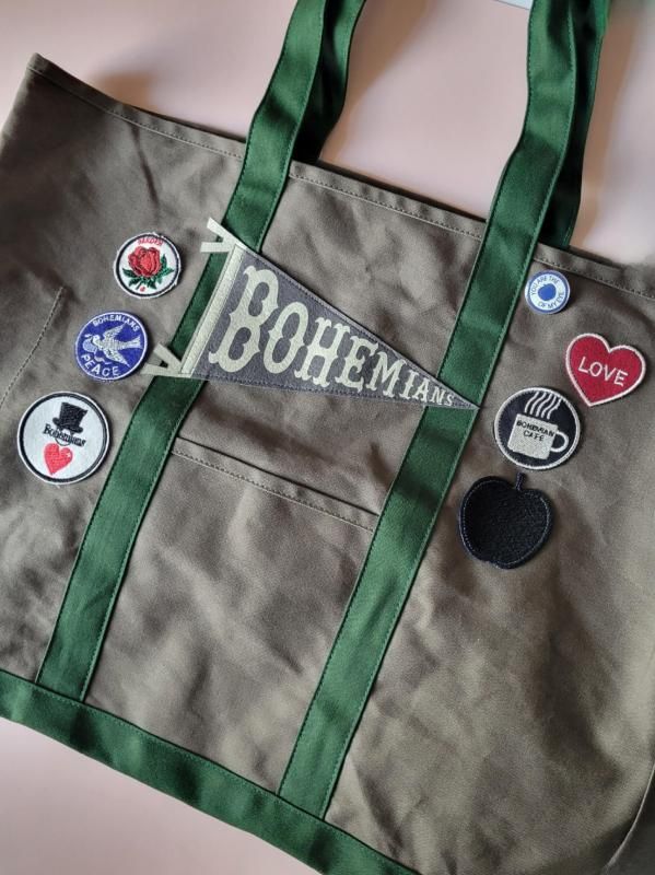 フラッグモチーフ、LOVE&HATといった、『Bohemians(ボヘミアンズ)』オリジナルのワッペンやピンバッジをあしらったトートバッグ。